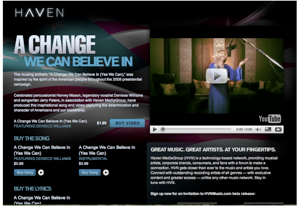 The Haven Network is a web-based business where music, entertainment and information converge. HVN360, the public brand, markets music artists to corporations on the B2B site and consumers on a robust B2C site which features e-commerce, broadband video and community features. Artists control the content on their mini-sites with a password protected dashboard.